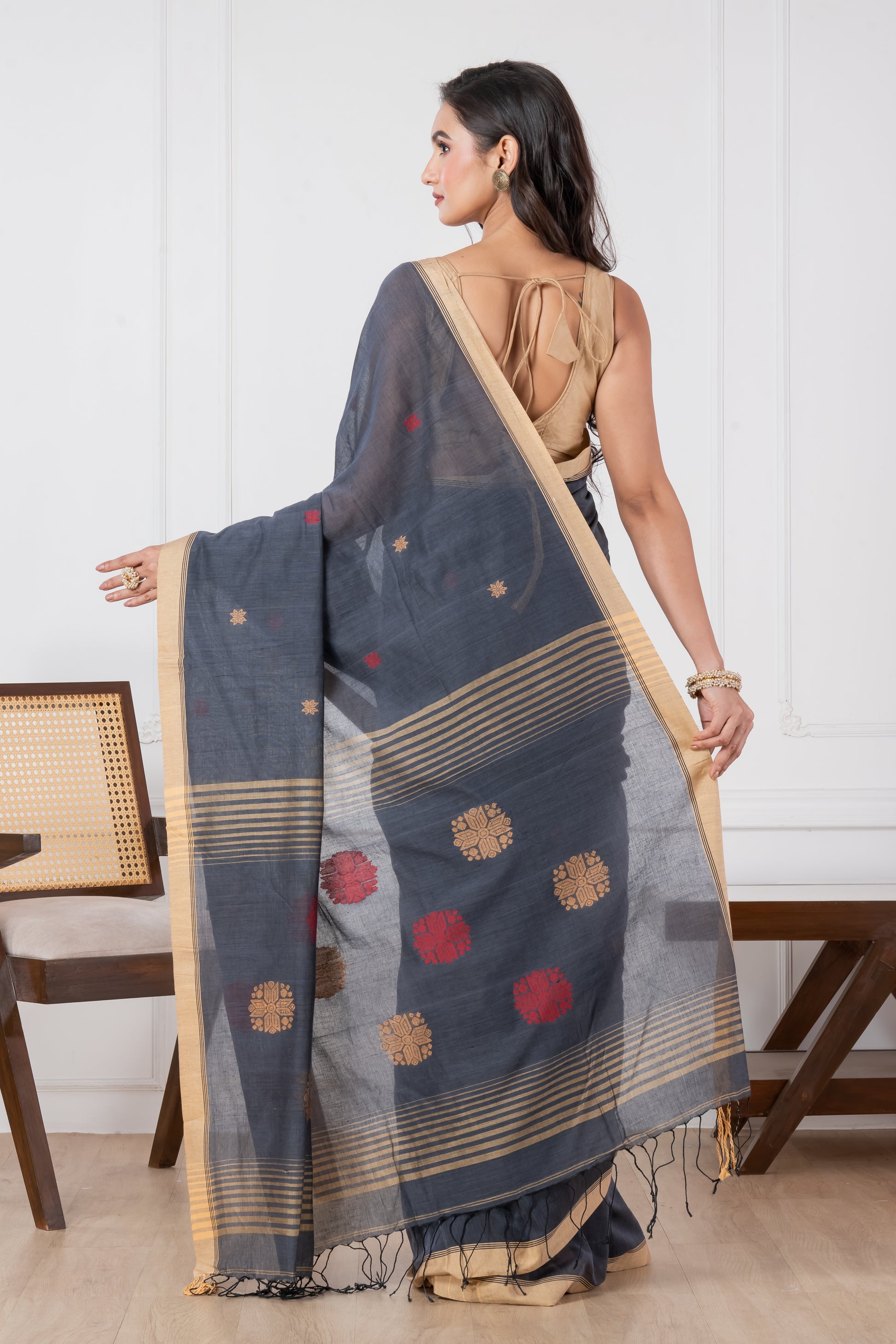 Discover the perfect blend of subtle elegance and vibrant detail with our Premium Gray Handloom Mercerized Cotton Saree. The sophisticated slate gray body serves as a serene canvas for the meticulously hand-woven red and yellow motifs, adding a pop of sunshine and warmth to the ensemble. Crafted from high-quality mercerized cotton, this premium handloom saree possesses a delicate silky sheen and a remarkably soft texture. Lightweight and incredibly breathable, it drapes like a dream, making it a luxurious choice for both long celebrations and elegant daytime events.