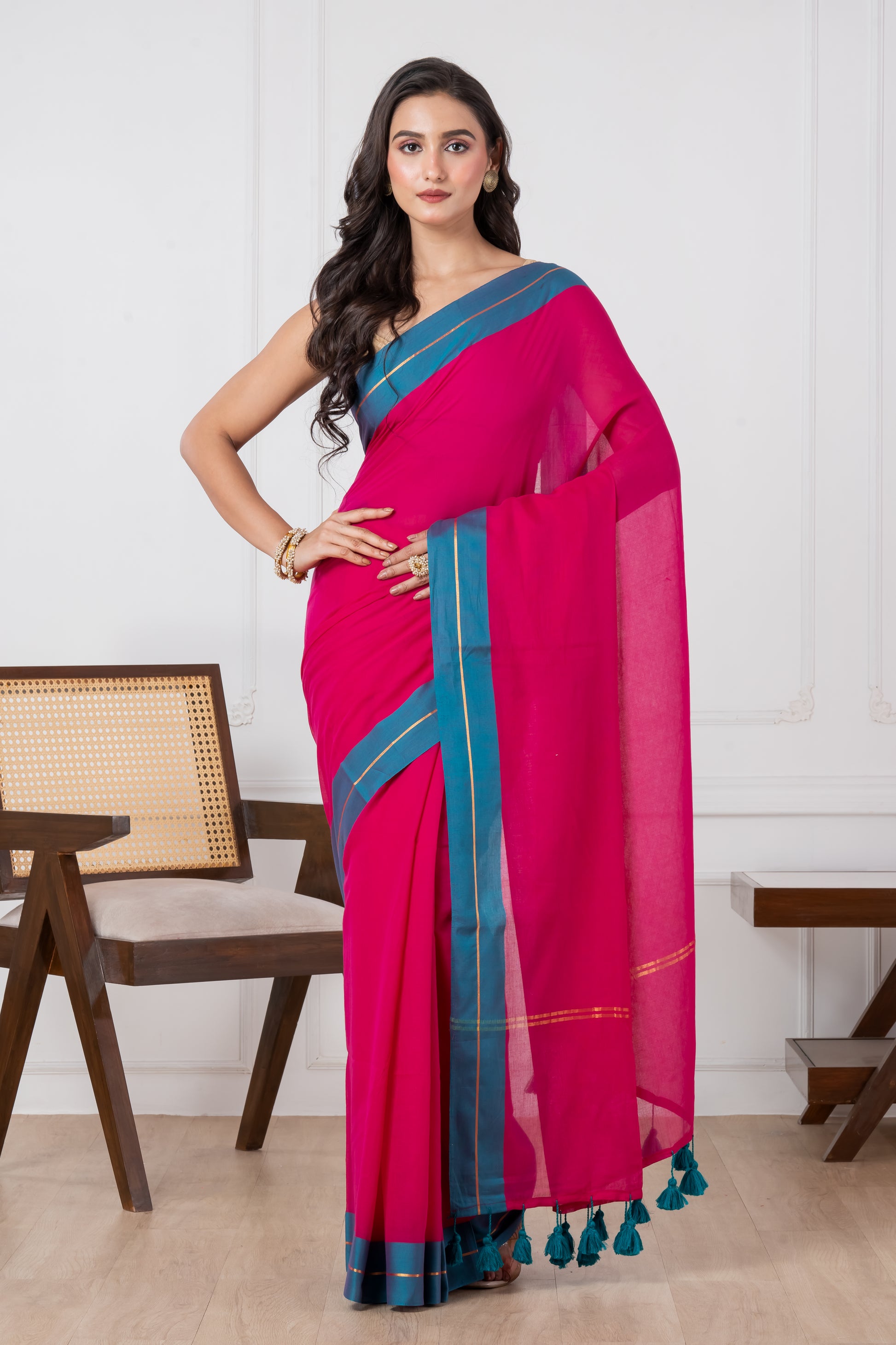 Pure Vibrant Magenta body & Teal Blue Border Mul Cotton Saree