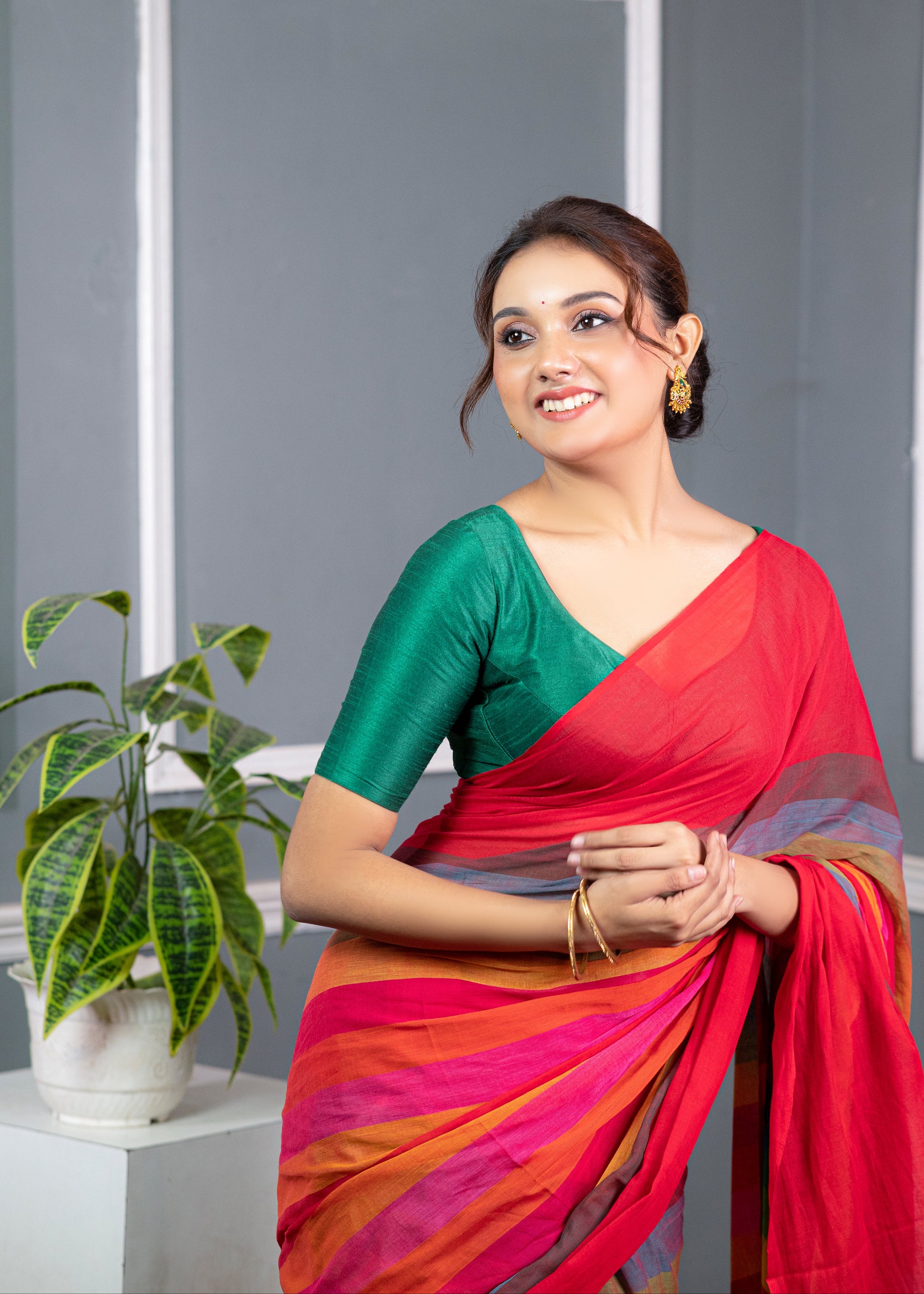Immerse yourself in a world of colors with our exquisite Red Striped Mul Cotton Saree. Crafted from the finest Mul cotton, this saree offers unmatched comfort and breathability. Its vibrant red hues make it a perfect choice for a variety of occasions, from office meetings to evening parties.